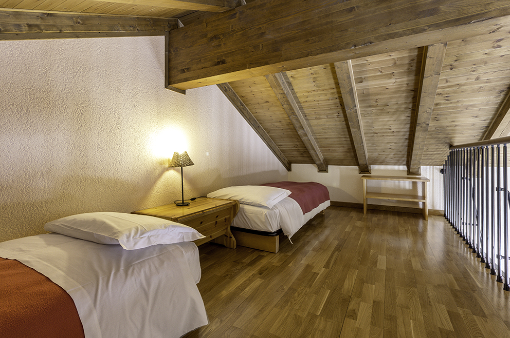 Inoltre uno "chalet-suite" con soppalco è ambientato con elementi caratteristici come le travature e la scala in legno che si fondono al meglio con i complementi di arredamento funzionali e moderni.